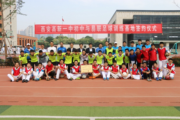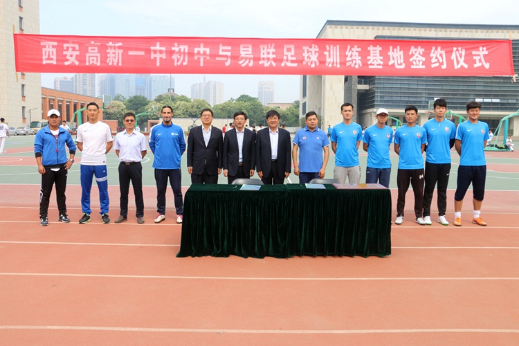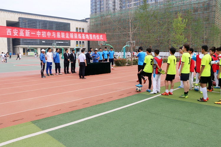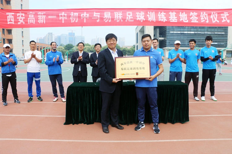 6月4日上午9时,在我校操场举行了高新一中初中和易联足球基地携手推进校园足球发展的签约授牌仪式,王凤进校长、张振斌常务副校长、校工会吴永胜主席等校方领导与易联足球基地胡志刚总经理及部分优秀教练员参加了签约授牌仪式。随着王校长和胡总经理在协议书上落笔签名,并授予易联为我校足球训练活动基地,意味着我校在校园足球腾飞的道路上又结识了新的伙伴,开拓了学生参与学习足球的新天地。