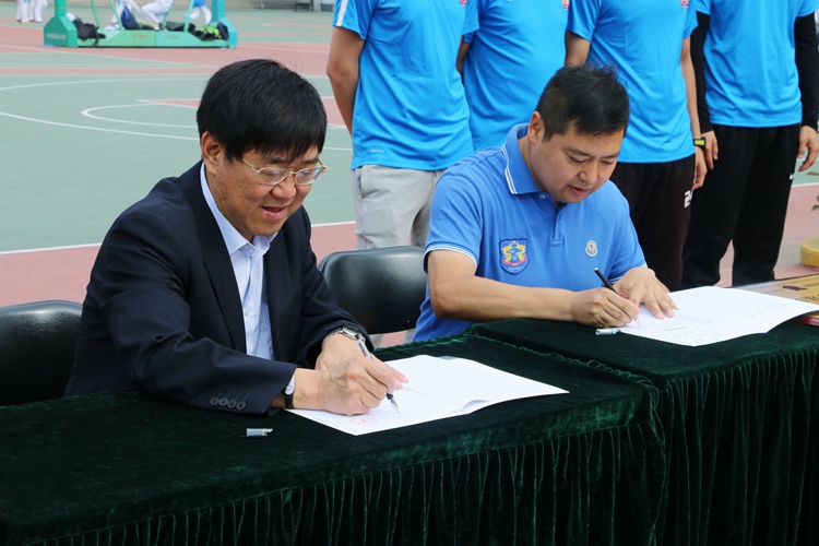 我校校长王凤进和易联足球俱乐部经理胡志刚在双方合作协议上签字。依据协议,易联足球俱乐部将成为我校足球训练基地,该俱乐部将为我校足球队训练提供场地和技术支持。