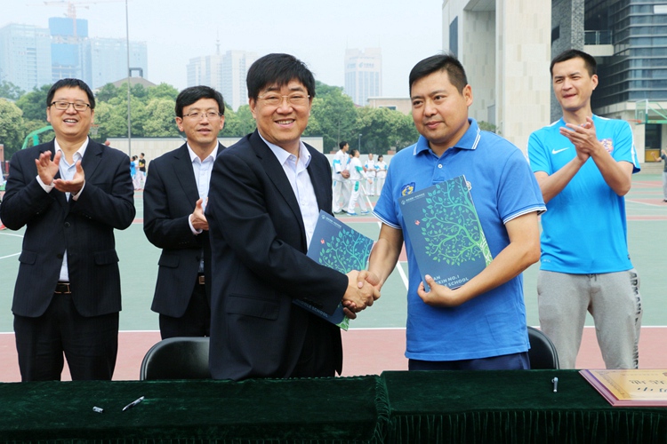 王凤进校长、张振斌常务副校长、校工会吴永胜主席等校方领导与易联足球基地胡志刚总经理及部分优秀教练员参加了签约授牌仪式