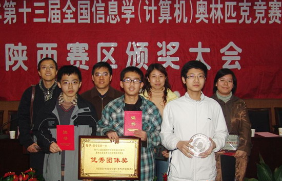 我校在2007年第十三届全国青少年信息学(计算机)奥林匹克竞赛分区联赛中获得优异成绩,初中组获得一等奖2人、二等奖5人、三等奖2人,高中组获得一等奖1人、二等奖3人、三等奖4人。同时,我校荣获优秀团体奖,梁萌、冯彦、党斌三位老师获得优秀辅导教师称号。