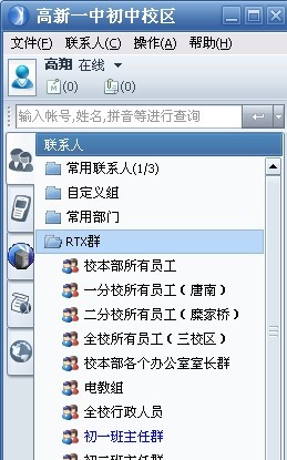 在这里,老师们可以看到自己身处于哪些群中,群中发消息,发文件的方式和qq类似,不过有一点需要提醒各位老师,我们的腾讯通是用来做校园无纸化办公的,群的使用是为老师们之间尤其是教研组内部沟通带来便利的,所以,请老师们尽量不要在全校教职工的群中随便发消息,因为一个人发一条消息,全校所有教职工必须接收这个消息,有时候会影响其他老师办公,谢谢合作!如果哪些老师有自己的工作需要,想跟某些教研组或者某几位老师创建属于你们自己的群组,请您通过腾讯通联系我,我会尽快帮你创建!