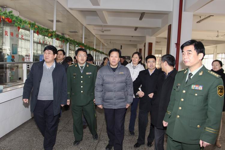 图为一中初中校长王凤进(左一)陪同省公安厅副厅长张恒(中) 和省公安厅消防局副局长张华民(右一) 等领导检查学校餐厅