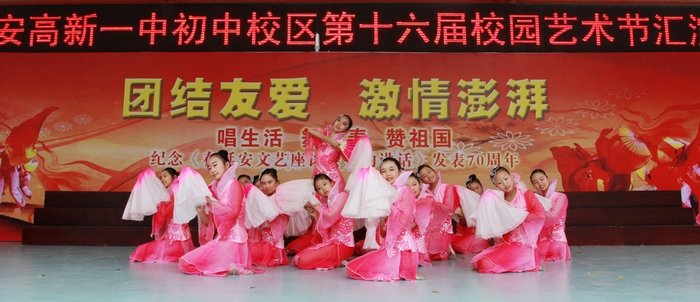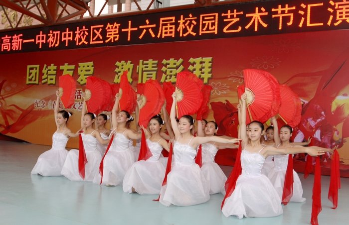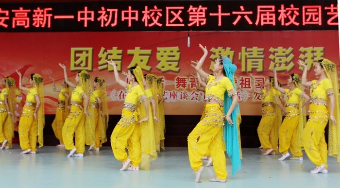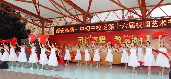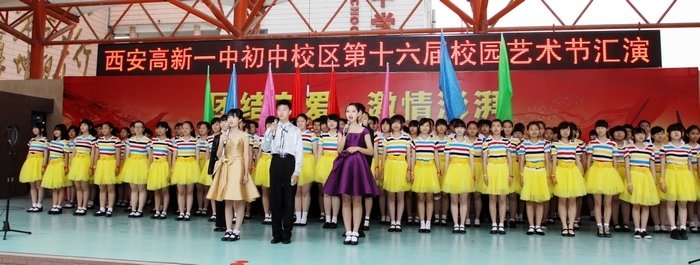 建校十六年来,我校共举办了16届校园艺术文化节。在每年的艺术节期间,学校都为学生安排了丰富多彩的文化活动。其中包括学生美术作品展,学生文化体恤衫创意设计走秀,学生个人美术作品展,学生文艺节目汇演。在2010年第14届艺术节期间,学校举办了以“祖国·青春·活力”为主题的合唱节,与西安市慈善会联合举办高新一中初中校区第十四届艺术节书画作品义卖活动。同学们将自己的书画作品变成了一份份爱心,共筹得善款7614元,捐献给了青海玉树地区称多县寄宿小学。2011年第十五届校园艺术节期间,学校举办了主题为《仁爱·志趣·典雅》“中华古典诗文唱读比赛”,学生利用各种艺术形式诠释中华文化的精神内涵,收到了良好的效果。