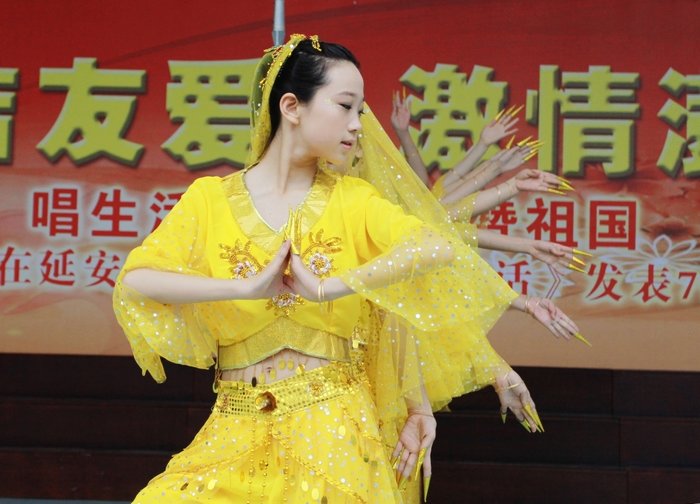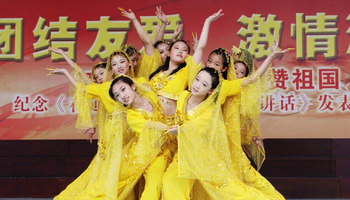 整场文艺汇演节目形式多样,高潮迭起,不时引起学生的热烈掌声。傣族舞《在小池边》演绎了居住在西双版纳的傣族人民间流行的民间舞,模仿孔雀漫步森林、饮泉戏水、追逐嬉戏,学生表演倾情投入、惟妙惟肖。二重唱《祖国万岁》展现了学生的激情豪迈,唱出了祖国的花朵们誓做社会主义建设接班人的崇高信仰。“让我在巍峨的大厦上欢呼和陶醉,看万里江山,都是风光明媚”,高昂的歌声引起学生共鸣,活动现场热情洋溢。由七年级A组一百多位男生合唱的《保卫黄河》《游击队歌》慷概激昂、催人奋进,使在场观众深受感染。活动现场,连家长们也迫不及待了,他们一改往日的严肃,几十位家长为在场的孩子们演唱了《让我们荡起双桨》,听到自己家长的歌声,不少学生不禁打着节拍跟着同声哼唱。