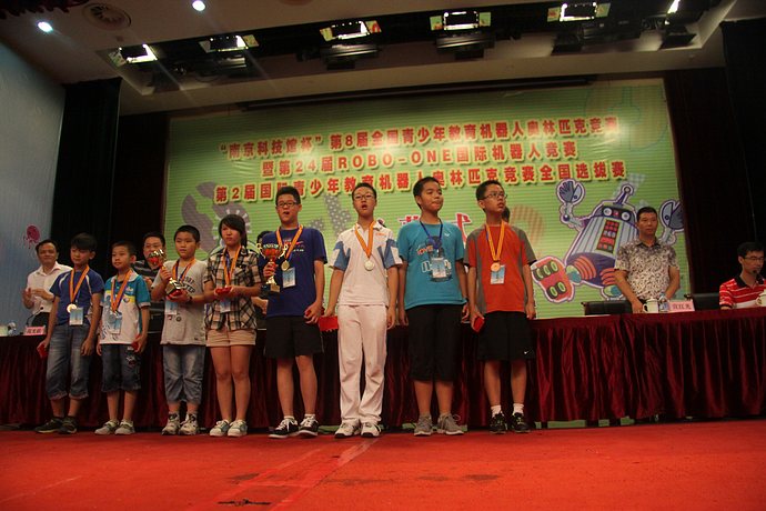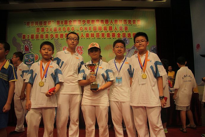 到达南京后,需要克服炎热和水土不服,但大家没有抱怨,每个同学都自觉的积极准备比赛,为机器人充电、不断的测试程序、分析突发事件的处理方法、检查辅助材料是否齐备等等,都到凌晨才休息,大家抱着每秒必争、克服一切困难的思想,比赛中的冷静发挥,力压来自全国各个省区的队伍,最终囊括机器人重量组足球冠军、亚军、季军;包揽了机器人遥控足球冠军、亚军;双足机器人舞蹈冠军、季军;现场竞技赛冠军;机器人搬运赛亚军、季军;双足机器人技能赛亚军等殊荣。我校学生共获得8枚金牌、7枚银牌、6枚铜牌,一等奖26人次、二等奖11人次、三等奖8人次,高新一中初中校区获得总积分第一名的好成绩,我校获得“优秀代表队”一等奖第一名。马文杰老师也荣获全国优秀指导老师称号。因我校机器人全国等级考试中的卓越表现,高新一中初中校区荣获 “全国青少年教育机器人等级考试考优秀考点”称号。