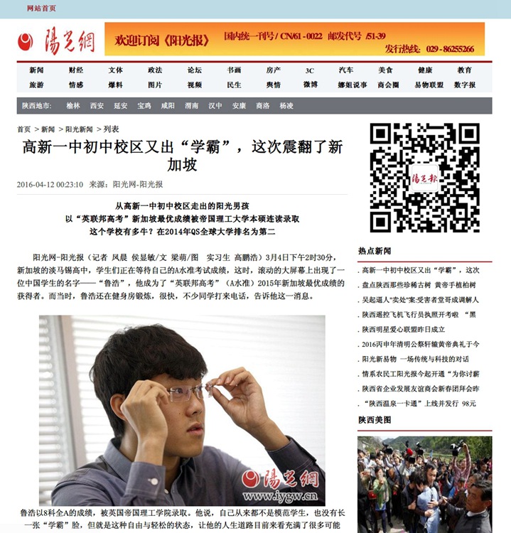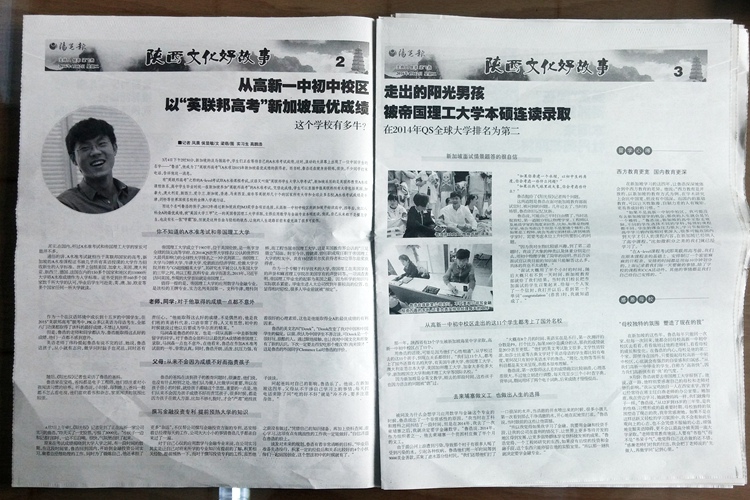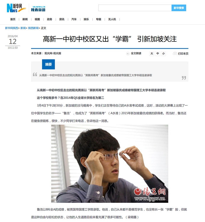 4月12日,《阳光报》2、3两版对我校公派新加坡留学生鲁浩同学进行了题为《从高新一中初中校区走出的阳光男孩以“英联邦高考”新加坡最优成绩被帝国理工大学本硕连读录取》的跨版报道。