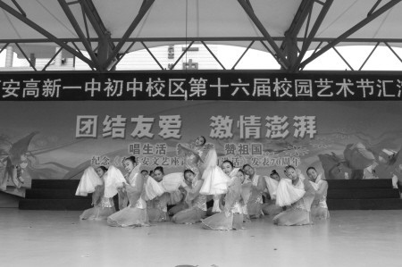 整场文艺汇演节目形式多样,高潮迭起,不时引起学生的热烈掌声。傣族舞《在小池边》演绎了居住在西双版纳的傣族人民间流行的民间舞,模仿孔雀漫步森林、饮泉戏水、追逐嬉戏,学生表演倾情投入、惟妙惟肖。二重唱《祖国万岁》展现了学生的激情豪迈,唱出了祖国的花朵们誓做社会主义建设接班人的崇高信仰。“让我在巍峨的大厦上欢呼和陶醉,看万里江山,都是风光明媚”,高昂的歌声引起学生共鸣,活动现场热情洋溢。由七年级A组一百多位男生合唱的《保卫黄河》《游击队歌》慷概激昂、催人奋进,使在场观众深受感染。活动现场,连高新一中的家长们也迫不及待了,他们一改往日的严肃,几十位家长为在场的孩子们演唱了《让我们荡起双桨》,听到自己家长的歌声,不少学生不禁打着节拍跟着同声哼唱。