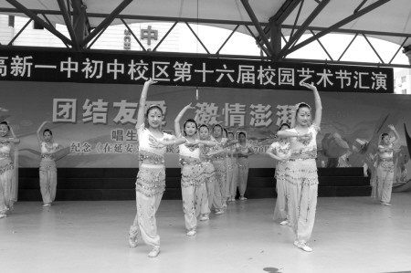 据了解,高新一中初中校区本次艺术节包含两大主题,一是以“大爱无疆——我们以才华奉献爱”为主题的慈善义卖活动,首先是器乐演奏,学生们在音乐老师的组织下由七八年级学生表演了钢琴、小提琴、长笛、二胡音乐作品。然后美术老师从几百幅学生的美术作品中选取了近一百幅作品义卖。除了学生演员和学生作者之外,学校特意邀请了高新一中初中校区“校园之星”和他们的家长参加到活动中。义卖活动募得款项一万余元,将全部捐给山区学校建设图书馆。二是学生文艺节目表演,同学们以歌唱、舞蹈等形式歌唱幸福生活,舞动美好青春,赞美伟大祖国。
