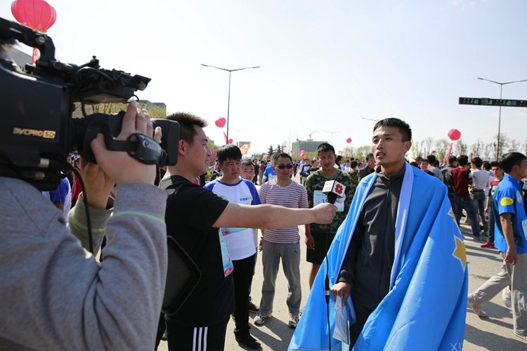 西安电视台对越野赛男子组冠军祝航舟进行现场采访