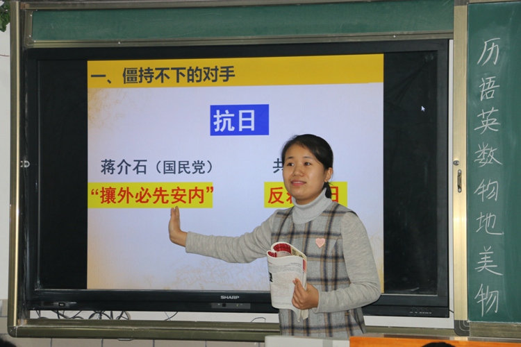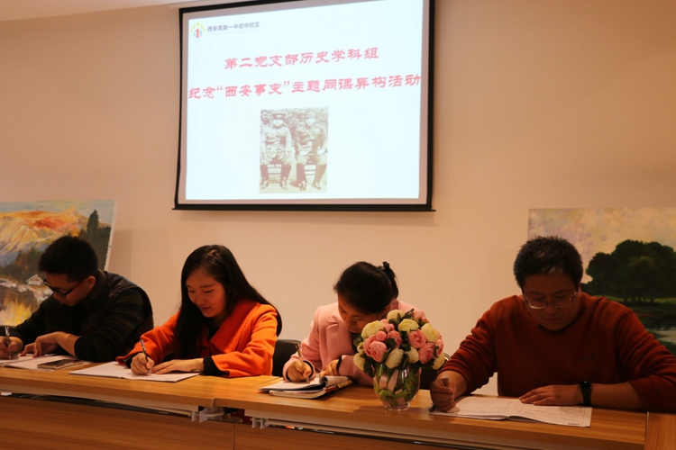 为响应高新一中初中校区党总支关于创新党员教育实践活动的号召,培养学生的爱国主义情怀,提升教师自身的业务能力。在第二党支部的精心安排下,八年级历史学科组党员教师结合学科特点,在纪念西安事变发生80周年之际,开展了以“西安事变”为主题的同课异构活动,将社会主义核心价值观深入落实到教学中,同时支部党员间还开展交流研讨,切实将“两学一做”学习教育和教学实践有机地结合起来。