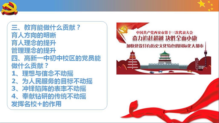 刘书记的党课围绕西安市第十三次党代会会议精神,以王永康书记“不要在最好的位置上睡觉,崇尚实干、狠抓落实”讲话精神为开篇,从“我们拥有的位置有多好”、“我们的目标是什么”、“教育能做什么贡献”、“高新一中初中校区党员能做什么贡献”四个方面,要求全体党员同志做好本职工作、努力为学校建设做出贡献,强化了在整顿党的工作作风、纯洁党的队伍新形势下,如何做一名合格的共产党员和卓越的高新一中初中校区人的重要性和必要性。这次党课形式新颖、内容丰富,如一缕春风,吹开了全体党员的心扉。