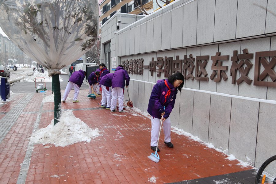 一场瑞雪给古城西安增添了独特的韵味,美丽的东区校园也披上了洁白的外衣。银装素裹的美景给大家带来欣喜的同时,也对出行的安全带来了隐患。1月5日,在东区校园内的积雪已被保安保洁彻底清扫干净的前提下,东区初级中学党支部积极响应学校党总支号召,支部书记张小英同志带领全体党员、青年教师、少先队员们利用中午休息时间走出校门,开展“温暖融冰”清扫积雪活动。