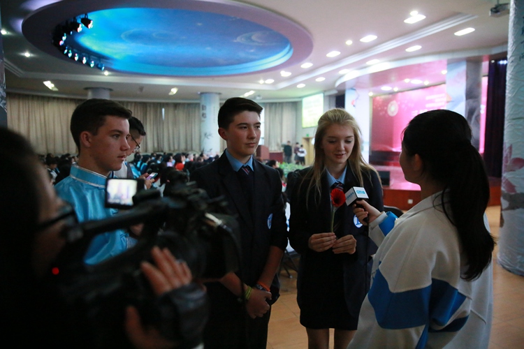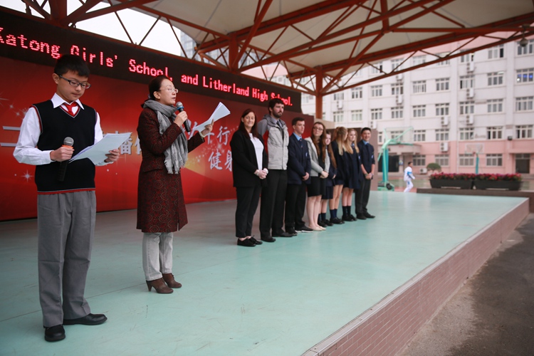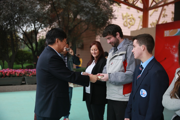 28日晨操期间,我校为英国师生举行了隆重的欢迎仪式,刘丽君副校长及双语班的两名学生主持人用中英双语向全校师生介绍了里瑟兰中学,英国师生随后也登台自我介绍并和我校师生打招呼互动。之后我校王凤进校长等学校领导为英国师生赠送了我校校服和汉英词典,并表示希望英国师生在我校期间能够多学中文,广交朋友,融入我们的校园之中。