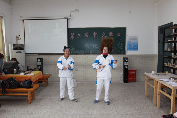 此次比赛学生们都显得十分重视,甚至提前一两周就开始了认真的准备。因此,整场比赛气氛热烈,精彩纷呈,笑点不断。比赛在高级班学生占瑞琪和初级班学生马康两位主持人精彩的中文开场白中拉开序幕,两位主持人风趣幽默的主持风格、流利标准的中文发音和灵活机智的现场应变让在场所有评委啧啧称赞。紧接着,选手们依次登台演唱。最先出场的是初级班学生马康、波邦和艾迪,他们演唱的歌曲是《super star》,三位选手演唱过程中表现得轻松活泼,他们有节奏整齐划一的“小电臀”引来了现场一拨又一拨的尖叫;随后出场的中级班学生丽丽和吴娟则以一首热情活泼的《对不起,我的中文不好》唱出了来中国求学的海外学子学习中文时遇到的苦辣酸甜,他们夸张诙谐的动作表情引发了阵阵欢笑。尽管手中握的是羽毛球拍,但演奏出的确是十足的吉他范,她们完美的表现赢得了现场观众和评委一浪高过一浪的欢呼呐喊;最后出场的高级班学生乐微、占瑞琪和依玛,她们演唱的是当今中国传唱度最高的神曲《小苹果》。三个学生载歌载舞,在原舞的动作之外结合整首歌的节奏加入自己编排的舞姿,二者相得益彰。学生标准的中文、自然协调的舞姿以及活泼跃动的旋律将现场的气氛推到了高潮,乐微最后的咬苹果更是引得全场一片欢呼。所有参赛曲目演唱结束后,在评委老师正紧张地计算比赛分数期间,全体留学生同学表演了一曲《shake it off》暖场,顿时现场的气氛high到最高点,每位学生