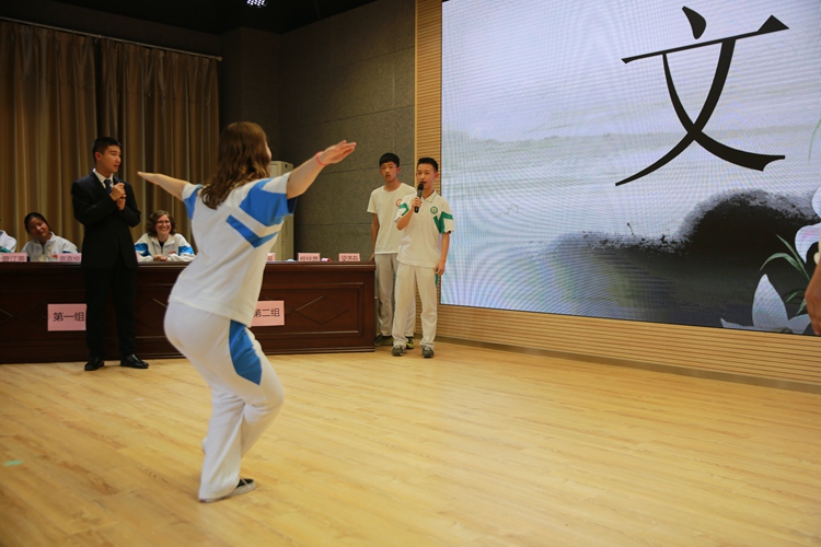 除了这些基本题目之外,竞赛中还设有一些游戏挑战,无论是中国学生还是美国学生都在游戏中抛开了胜负、乐在其中。在最后的猜题接力赛中,一共包括“你来比划我来猜、唱歌猜歌名、看海报猜角色以及汉字大猜想”四个环节。尤其在“唱歌猜歌名”这一环节中,需要留学生现场带耳麦听中文歌再来哼唱出来,大家循着洋腔洋调的哼唱声,几乎全场都参与了猜歌环节。在汉字大猜想中更是热闹,ppt中展示的诸如“文”、“心”等不好比划的汉字,留学生更是各种扭曲身体,引来台下一阵阵笑声。